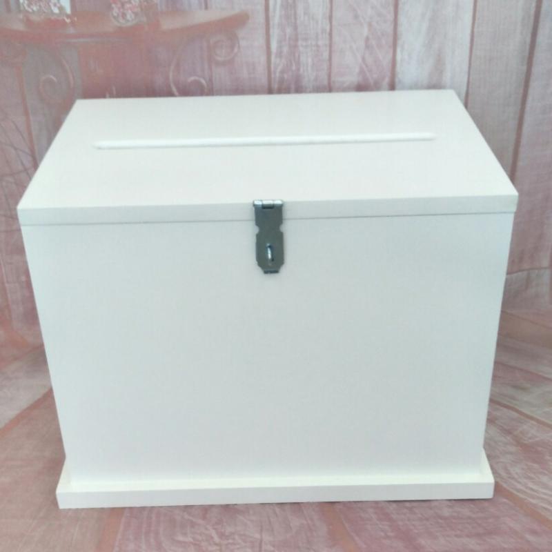 Made of smooth MDF and painted in a gloss white, these boxes can be dressed up or down to suit your theme. Wishing well box measures approximately 28cm H x 43cm W x 25 D and card slot measures approx 21cm wide. Finish includes a safety chain and quality fittings.